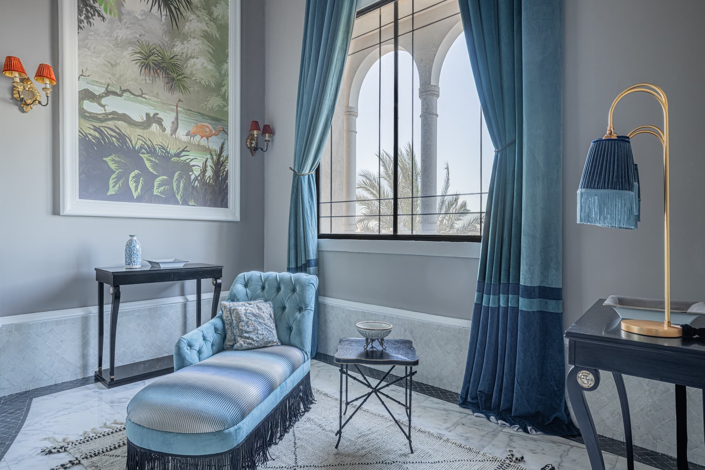 Pensée comme un refuge intime, cette suite de 120 m² vous invite à vivre une parenthèse hors du monde. La lumière y danse sur les matières nobles, les lignes Art déco épousent la délicatesse de l’artisanat marocain, et chaque détail murmure élégance et douceur.