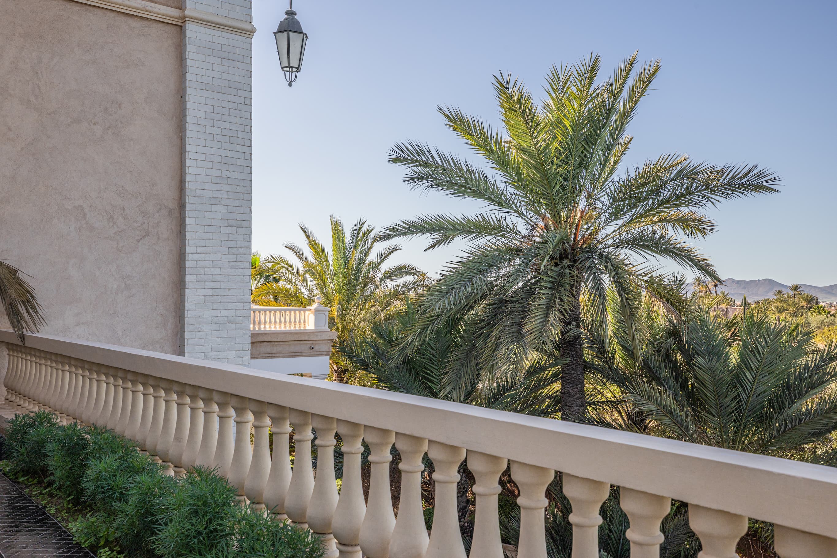 Sur la terrasse privée, le regard se perd dans la palmeraie infinie. Le matin s’y savoure en silence, le soir s’y partage à la lueur dorée du soleil couchant.